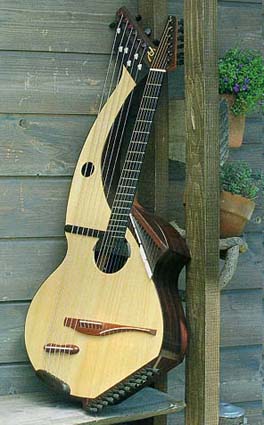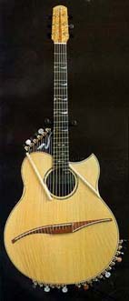コメント:24弦二重表甲ハープギター 低音はベースのEから高音は1弦の31フレットに相当するBまで、5オクターブ半の音域 を持つ(私が知る限りでは最も広音域の)ハープギターである。「風の歌が聞こえる」 「幸せを運ぶ器」「窓の外は光きらめき」で使用。この楽器を弾いている時によく思 うこと 「腕がもう二本ほしい・・・」 忙しい楽器である。しかし弾いている内に 最高の気分になれる。