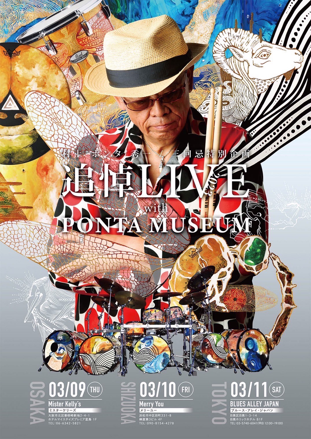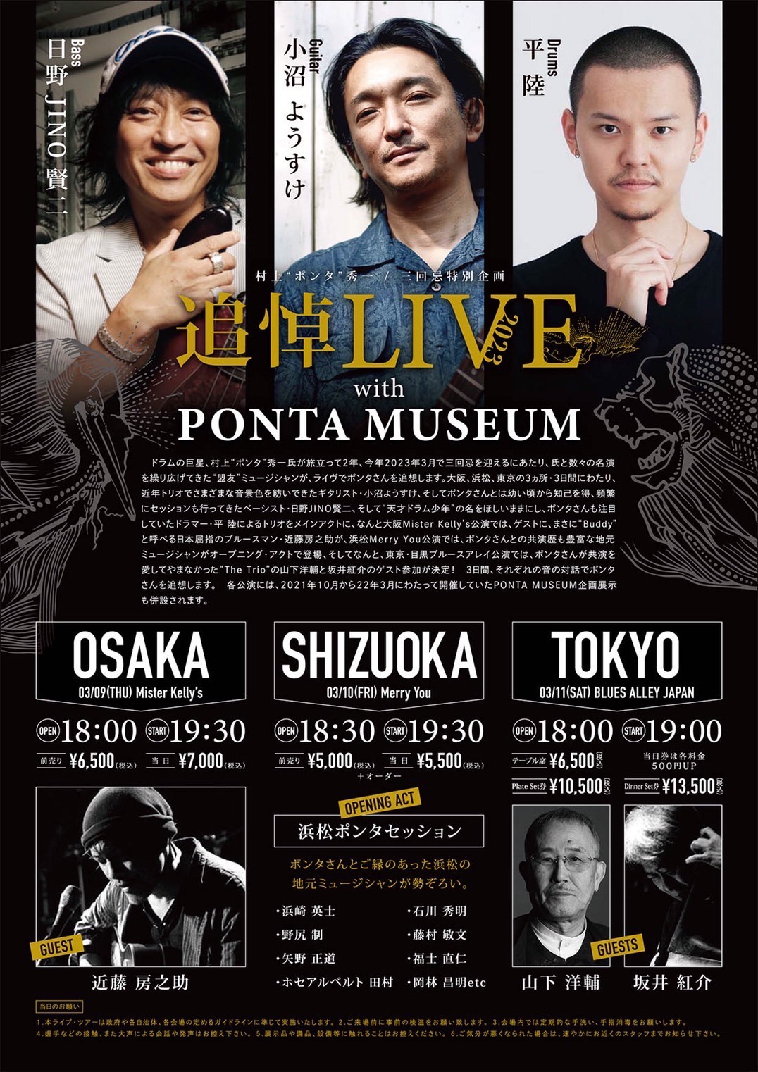 ドラムの巨星、村上"ポンタ"秀一氏が旅立って2年、今年2023年3月で三回忌を迎えるにあたり、 氏と数々の名演を繰り広げてきた"盟友"ミュージシャンが、ライブでポンタさんを追想します。 大阪、浜松、東京の3ヶ所、3日間にわたり、近年トリオで様々な音景色を紡いできたギタリスト・小沼ようすけ、 そしてポンタさんとは幼い頃から知己を得、頻繁にセッションも行ってきたベーシスト・日野JINO賢二、 そして"天才ドラム少年"の名をほしいままにし、ポンタさんも注目していたドラマー・平 陸によるトリオを メインアクトに、浜松MerryYou公演では、ポンタさんとの共演歴も豊富な地元ミュージシャンがオープニングアクトで登場、 音の対話でポンタさんを追想します。 各公演には2021年10月から22年3月にわたって開催していたPONTA MUSEUM企画展示も併設されます。
